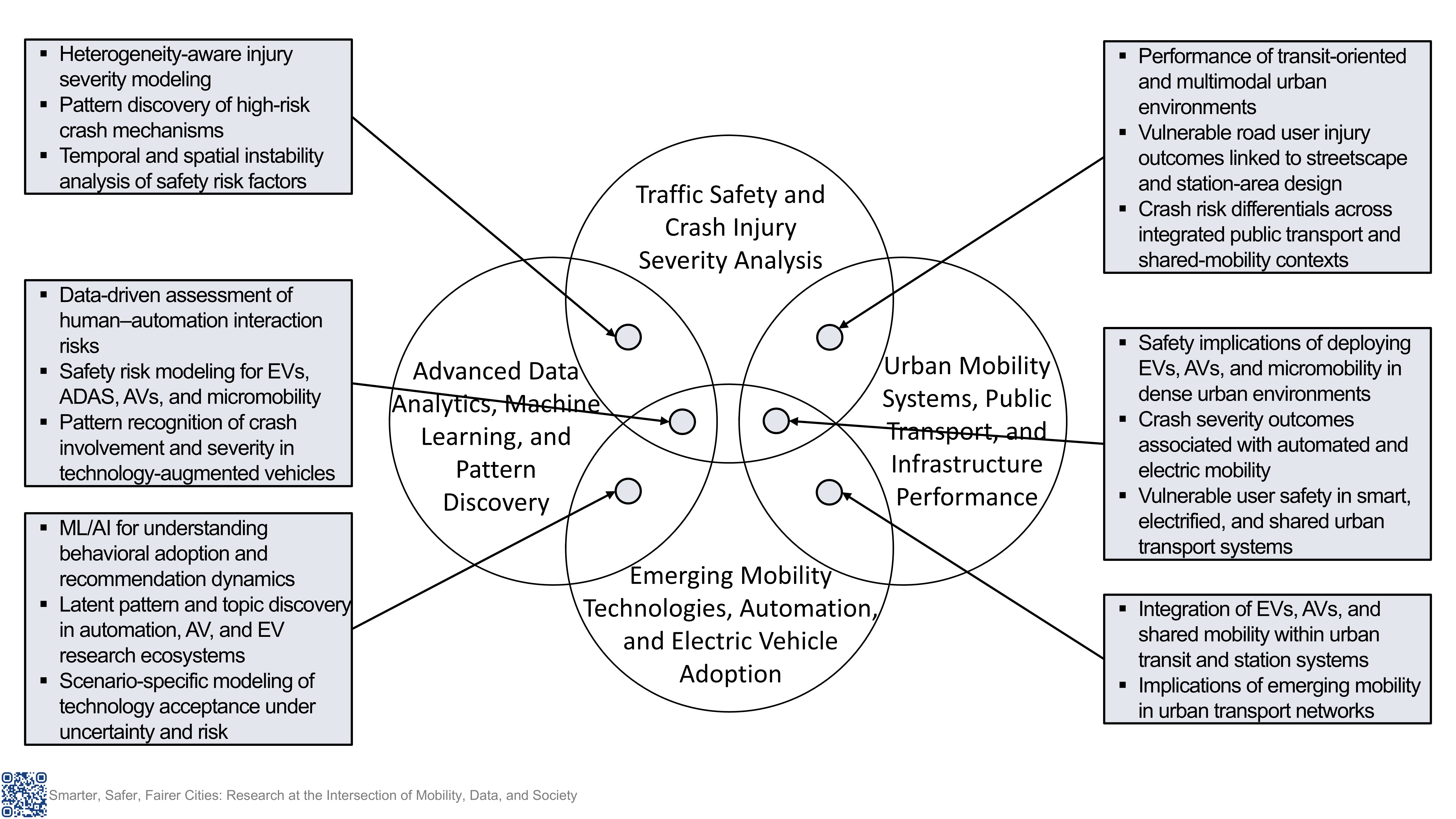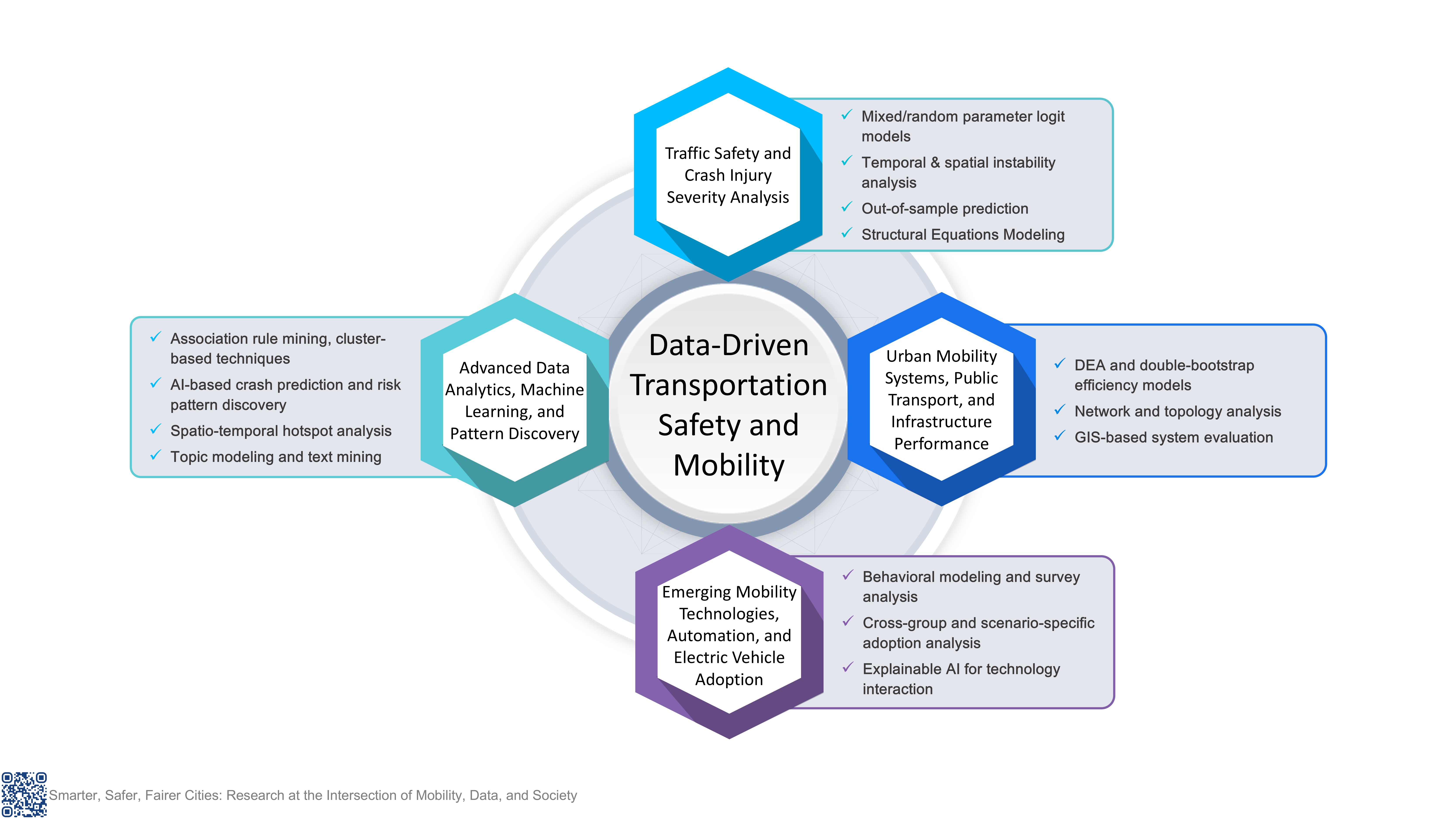 My research is interdisciplinary in nature. I use heterogeneity-aware models, pattern discovery techniques, and spatiotemporal analyses to uncover high-risk crash mechanisms and explain injury severity outcomes, with particular attention to vulnerable road users. Advanced data analytics and AI form the methodological core of my work, enabling the study of human–automation interaction risks, safety implications of EVs, AVs, and micromobility, and behavioral adoption under uncertainty. I also apply these methods to integrated public transport, shared mobility, and station-area environments to evaluate system performance, safety differentials, and the role of urban design. Overall, my research aims to generate data-driven insights that support safer, more efficient, and more equitable multimodal urban transportation systems.